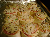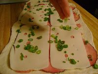 Line a 9X13-inch baking pan with non-stick foil. Roll bread dough into a rectangle 12X14 inches. Sprinkle with ranch dressing powder. Top with ham in a single layer, followed by a layer of Swiss cheese, and finally green onion/chives. Roll the long edge jellyroll style into a cylinder. Cut into 12 equal slices, placing each slice cut-side down in the baking pan with sides touching. Brush tops of rolls gently with melted butter. Mix together Parmesan cheese, garlic powder, onion powder and basil. Sprinkle evenly over the tops of rolls. Let rise in a warm place away from any draft until almost doubled in size, about 1 hour. Preheat oven to 350 F. Bake rolls 25 to 30 minutes, until done in the center and golden on top. Serve with spicy mustard. Voilà, merci beaucoup, Bon appétit, Sam